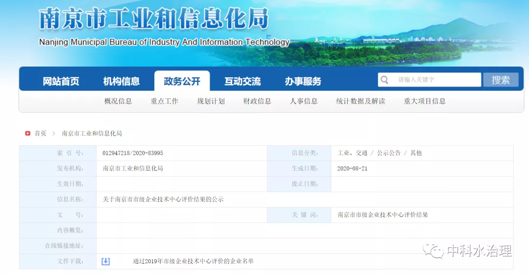 中科水治理獲得2019年“南京市市級(jí)企業(yè)技術(shù)中心”認(rèn)證