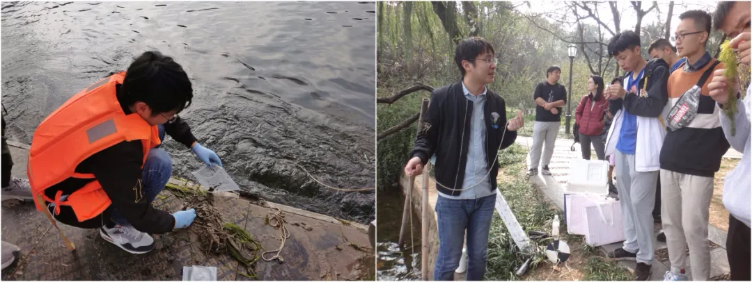 會議結(jié)束,由實驗室負責人唐坦先生帶領(lǐng)同學們到莫愁湖景區(qū),進行實地勘測水樣操作演練,進一步加強理論知識,為同學們未來走向職場開啟新篇章。