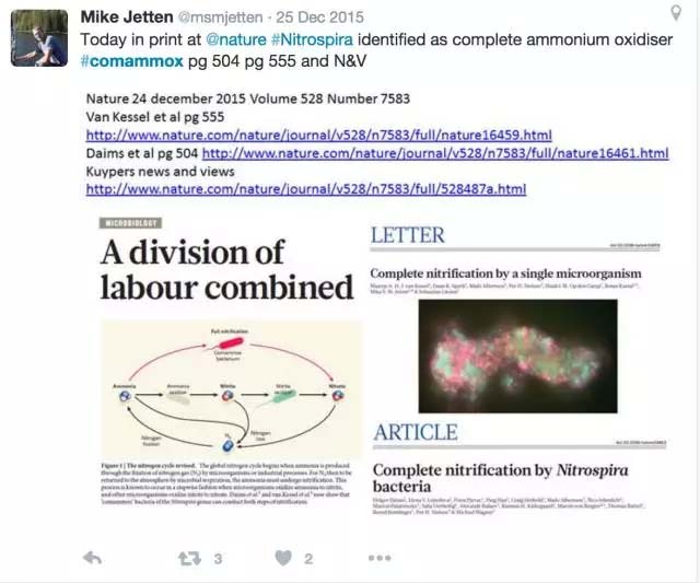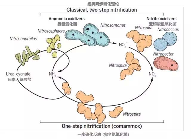 這個理論最先是由俄國微生物界傳奇維諾格拉斯基 (Sergei Winogradsky)早在19世紀(jì)末“成功”展示,他分離出了負(fù)責(zé)這兩步硝化的微生物,也就是所謂的AOB(ammonia oxidizing bacteria)和NOB(nitrite oxidizing bacteria)。但這個超過100年歷史的教條在2015年圣誕節(jié)前被英國明星科學(xué)雜志《自然》上的兩篇同日發(fā)表的題目雷同的文章和隨后一篇在美國微生物學(xué)會的文章終結(jié)了。三個科學(xué)團(tuán)隊(duì)發(fā)現(xiàn)了三種不同的培養(yǎng)[1,2]和一種非培養(yǎng)細(xì)菌[3]能夠各自進(jìn)行從氨氮到硝態(tài)氮的完全硝化過程。